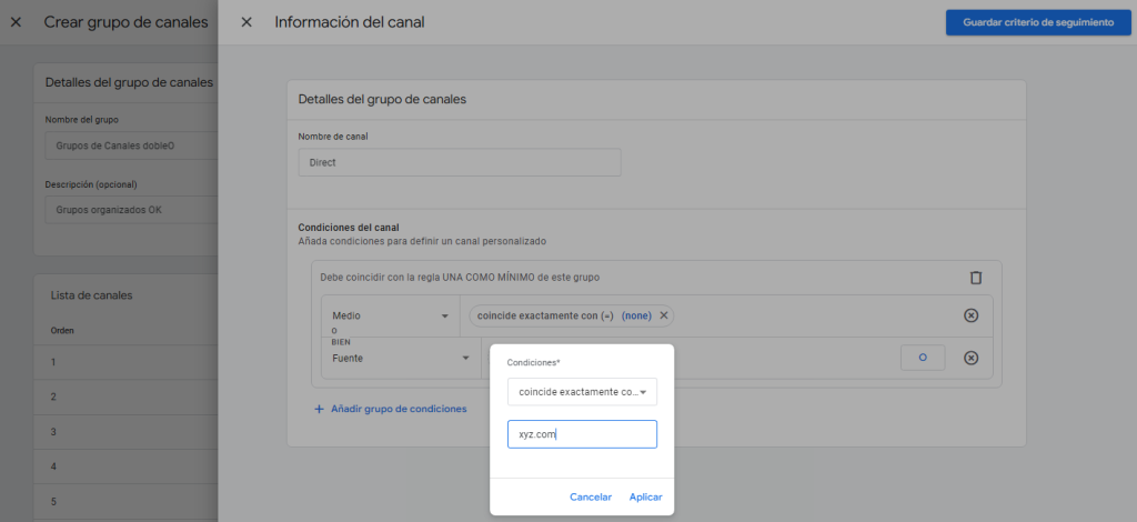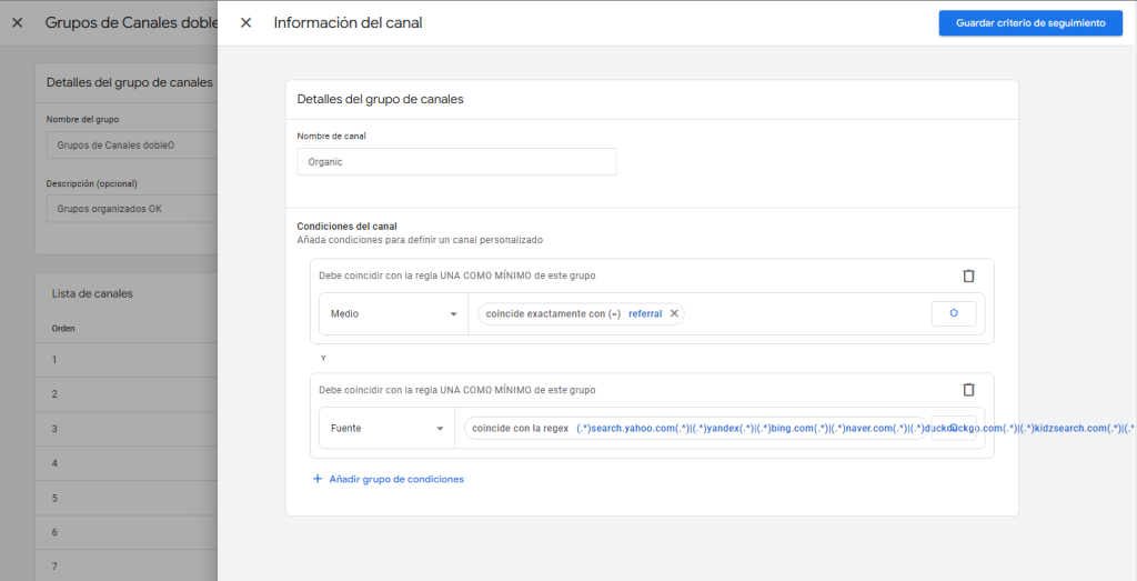 Para hacer esto, vamos a añadir un canal nuevo como Organic y vamos a incluir en las condiciones lo siguiente: