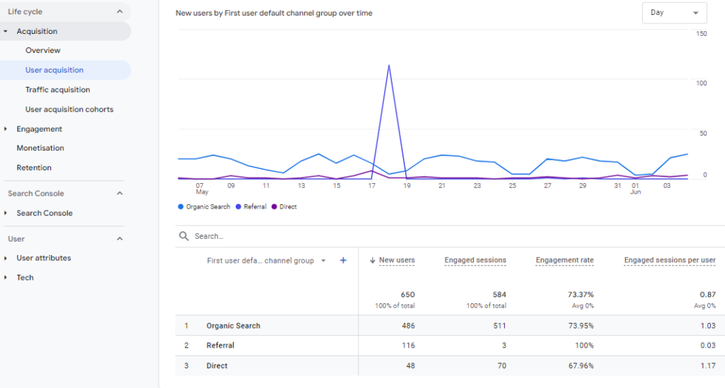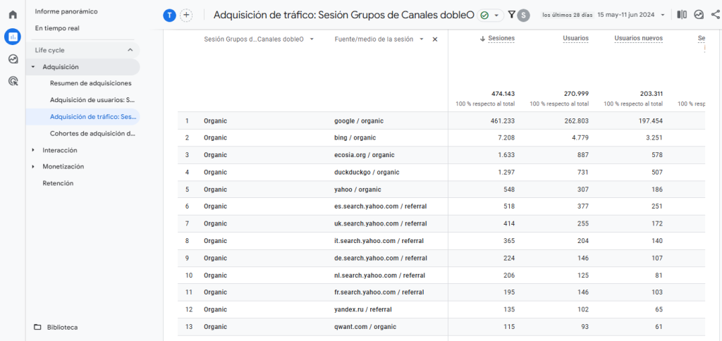 Podemos ver a continuación que nuestro Ejemplo 2 se está cumpliendo, ya que GA4 ahora está incluyendo el tráfico de buscadores que proviene del medio referral como «Organic».