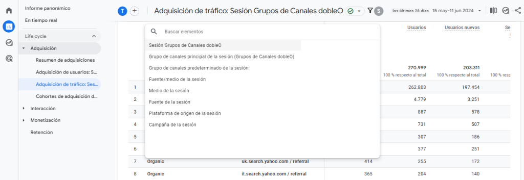 De esta forma, GA4 entenderá que debe incluir como «Organic» todas esas fuentes (yahoo, yandex, bing, etc.) del medio referral.