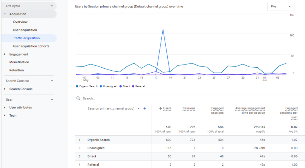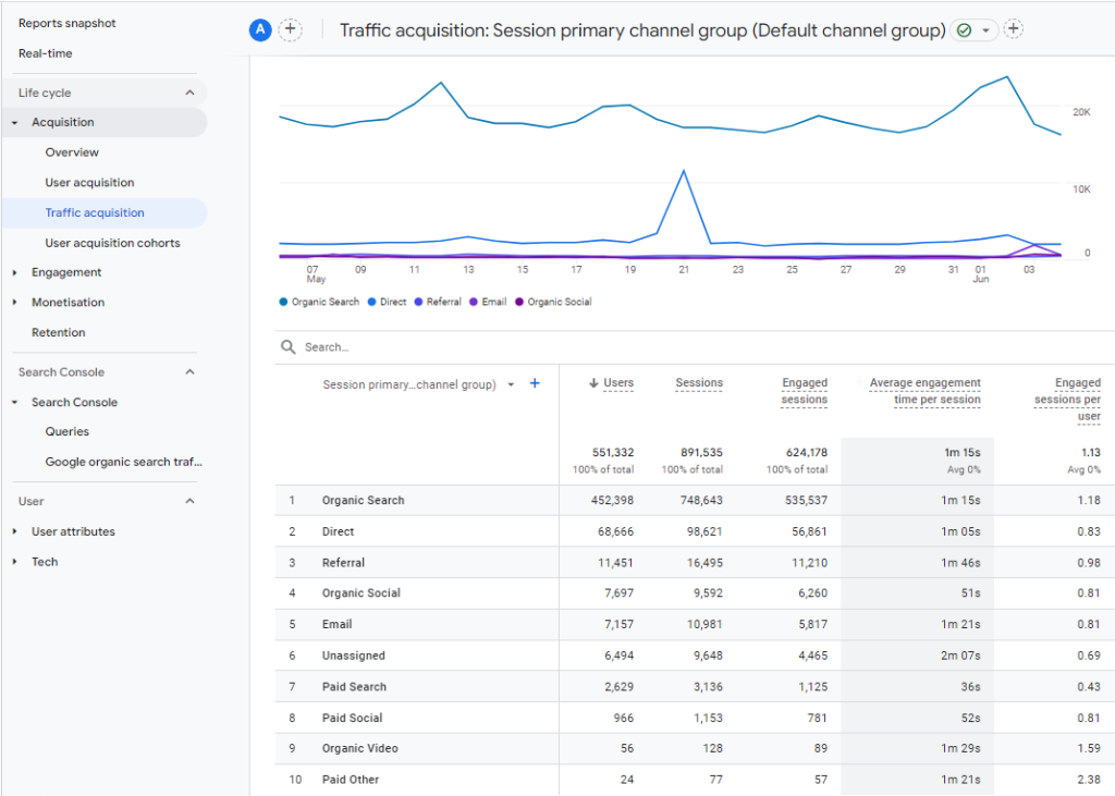 A diferencia de GA3, GA4 no tiene fuentes de tráfico predefinidas, pero clasifica automáticamente el tráfico en canales como búsqueda orgánica y social.
