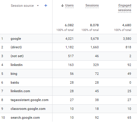 Por ejemplo, si una persona hace clic en un enlace puesto en Linkedin, Google Analytics 4 reportará «linkedin» como la fuente de tráfico.
