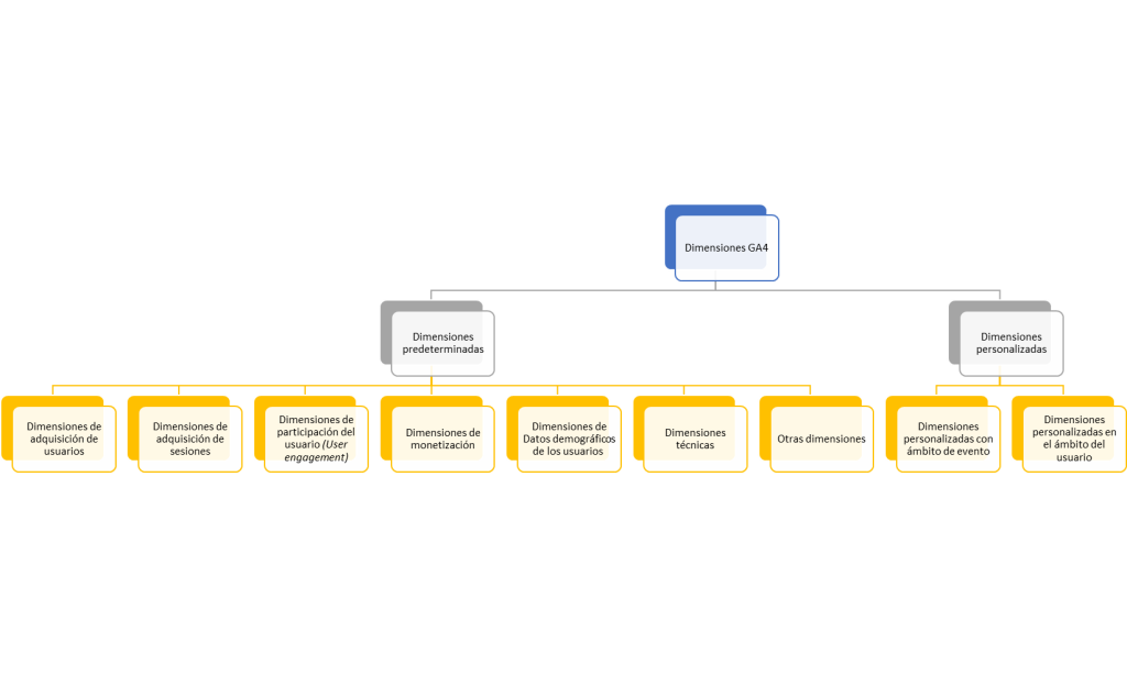 Las dimensiones pueden organizarse en función de 2 criterios, por un lado, podríamos categorizarlas según la forma de usarlas en GA4: