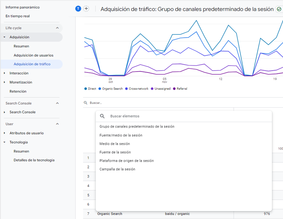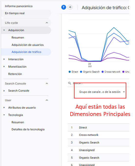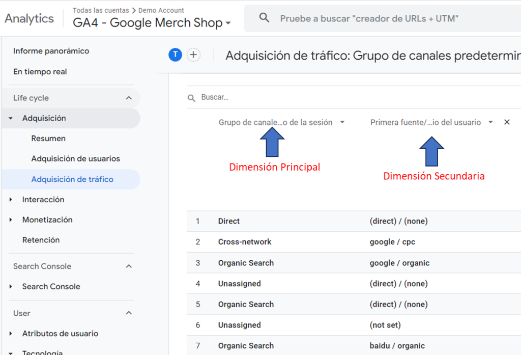 Cuando navegas a un informe, por ejemplo, Informe de adquisición de tráfico en tu vista de informes GA4, la dimensión predeterminada que ves que se aplica al informe es la dimensión principal: