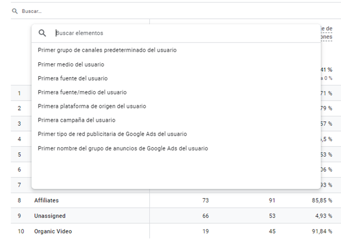 - Primer Fuente/medio del usuario: El sitio web y el canal de marketing a través del cual se adquirió al usuario por primera vez.
