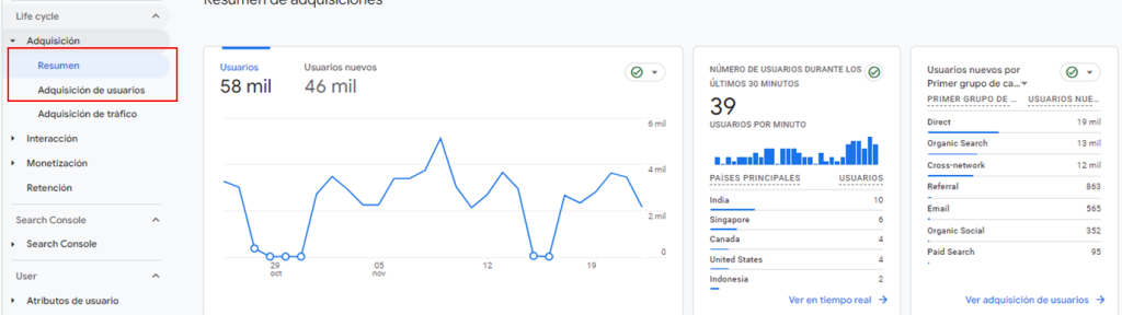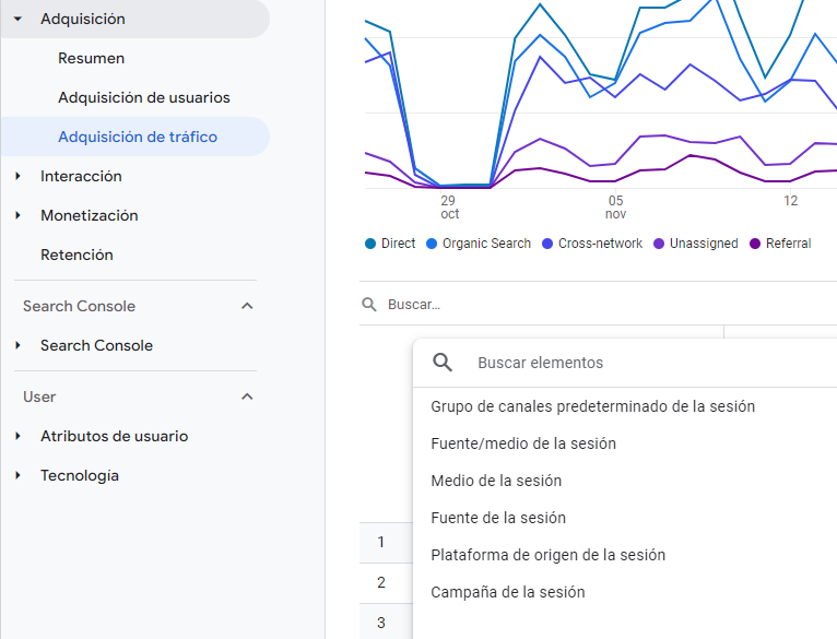 Puedes ver las dimensiones de adquisición de sesiones en los siguientes informes GA4: