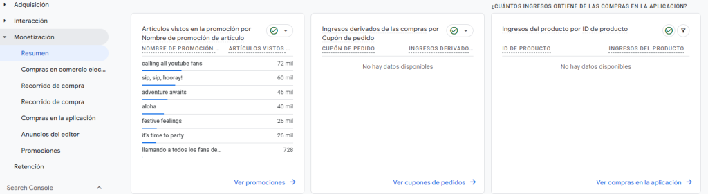 Puedes ver las dimensiones de monetización en los siguientes informes GA4: