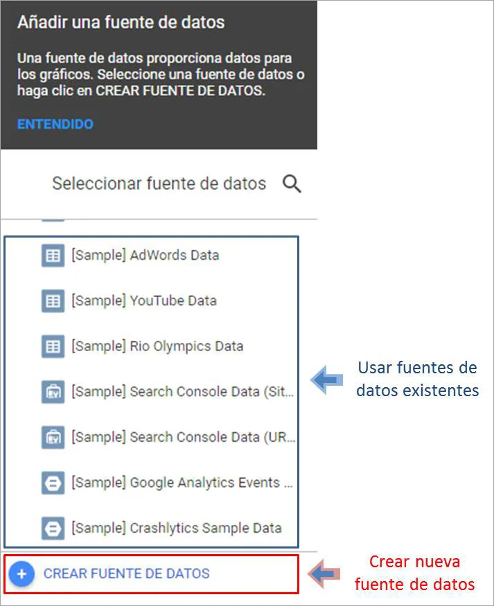 - Si no está creada, hay que crearla para poder usarla en el informe. Hacer clic en “CREAR NUEVA FUENTE DE DATOS” y seleccionar el conector deseado: Google Analytics, Google Adwords, Search Console, Youtube Analytics (…)