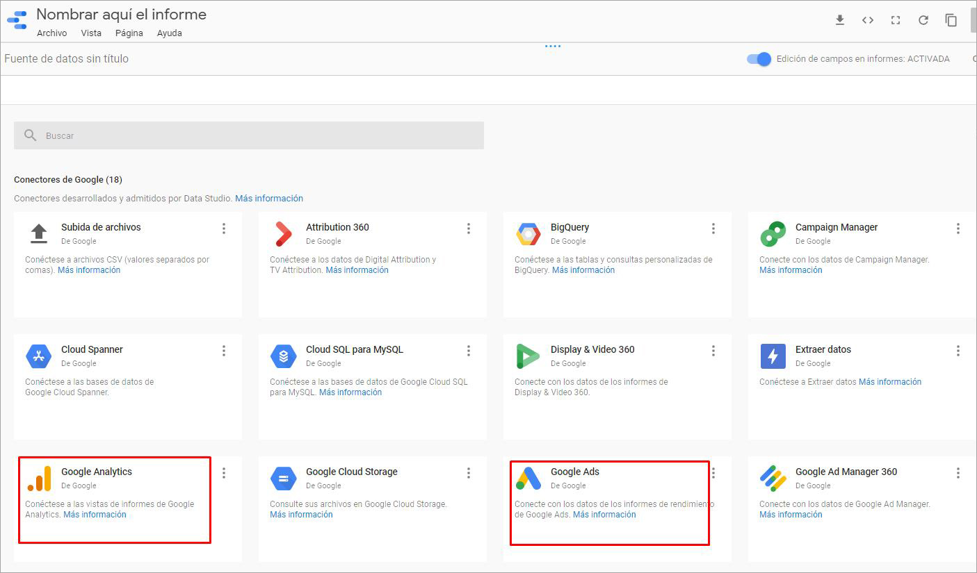 Como hemos explicado, para crear un informe Google Data Studio es imprescindible conectar la plataforma con fuentes de datos habilitadas, es ahí de donde se extraerán los datos que queremos analizar. Estas fuentes de datos son gratis o de pago y se pueden mezclar dentro de un mismo informe ( Ej: datos de Google Ads y de Google Analytics).