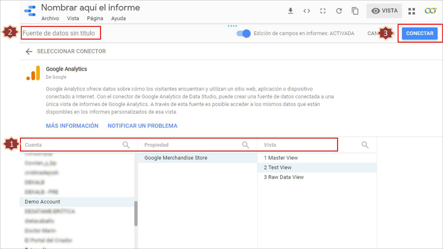 1. Seleccionar la cuenta/propiedad/vista de datos de donde queremos sacar los datos