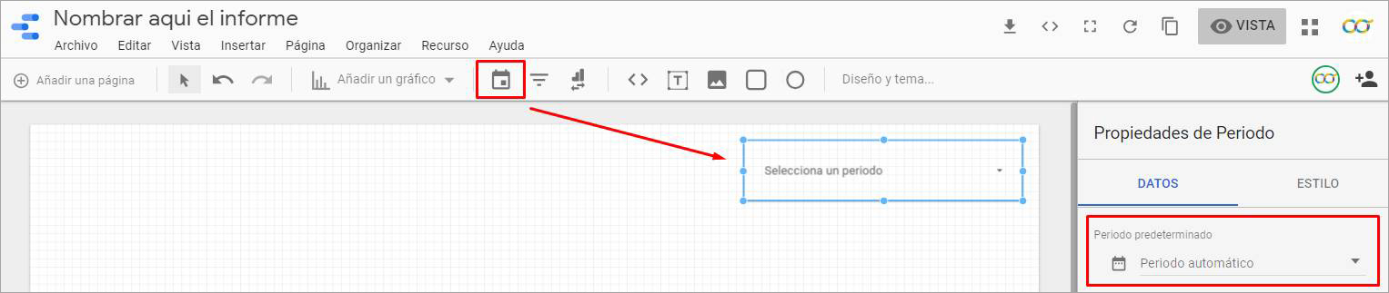 Lo primero de todo es añadir un elemento de control, para poder seleccionar rangos de fechas o para empezar la creación de nuestro informe: