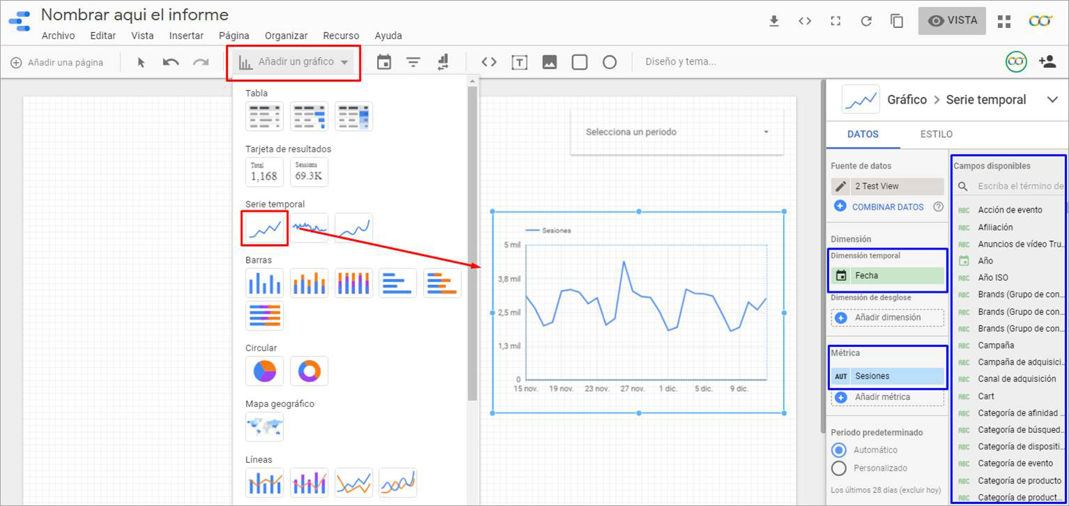 - Para incluir un gráfico, seleccionar un formato en el menú desplegable y dibujarlo en la hoja del informe. En el panel de la derecha (llamada “Campos Disponibles”, en azul), se pueden elegir las dimensiones y métricas que queremos mostrar, en este caso, en la gráfica de serie temporal recién creada. Las métricas y dimensiones disponibles corresponden a las de la fuente de datos elegida.
