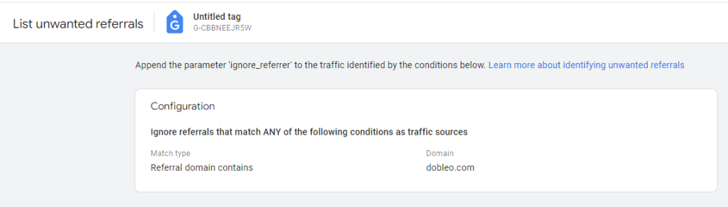 Entonces, la mejor práctica es añadir el nombre de tu dominio o los dominios involucrados en el seguimiento entre dominios a la lista de referencias no deseadas:
