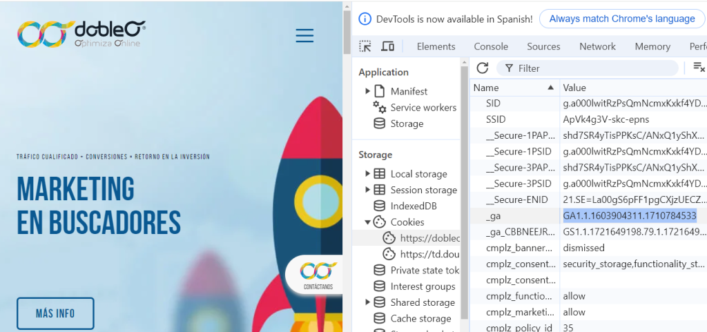 Dado que, por defecto, Google Analytics configura la cookie en el dominio de segundo nivel más alto del nombre de host actual, la cookie _ga se configurará en ‘.dobleo.com’