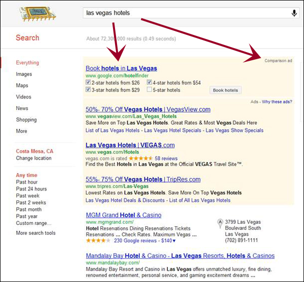 Este comparador ocupa un lugar Premium en la página de Google, desplazando hacia lugares menos preferentes al resto de anuncios y a los resultados orgánicos. El usuario puede ver el precio de los hoteles sin necesidad de salir de google, por la plaza hotelera que haya buscado.