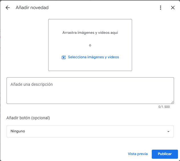 En el caso de que vayas a publicar una novedad en GBP, debes subir la imagen o el video, la descripción y el botón asociado a la publicación.