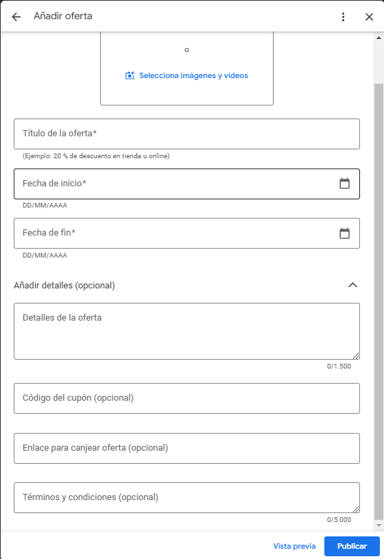En el caso de que vayas a publicar una oferta en Google Business Profile, debes subir la imagen o el video, el titulo de la oferta, fechas inicio y fin, detalles adicionales, código de descuento, enlace para canjear y los términos y condiciones de dicha oferta.