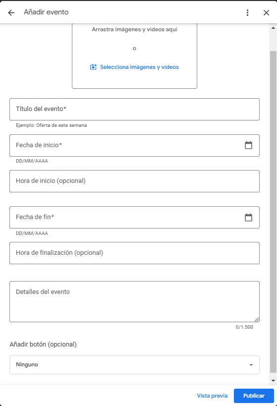 En el caso de que vayas a publicar un Evento en Google Business Profile, debes subir la imagen o el video, el titulo del evento, fechas inicio y fin, hora de finalización, detalles del evento y el botón.