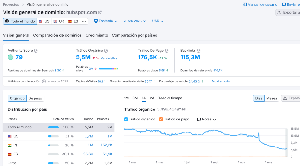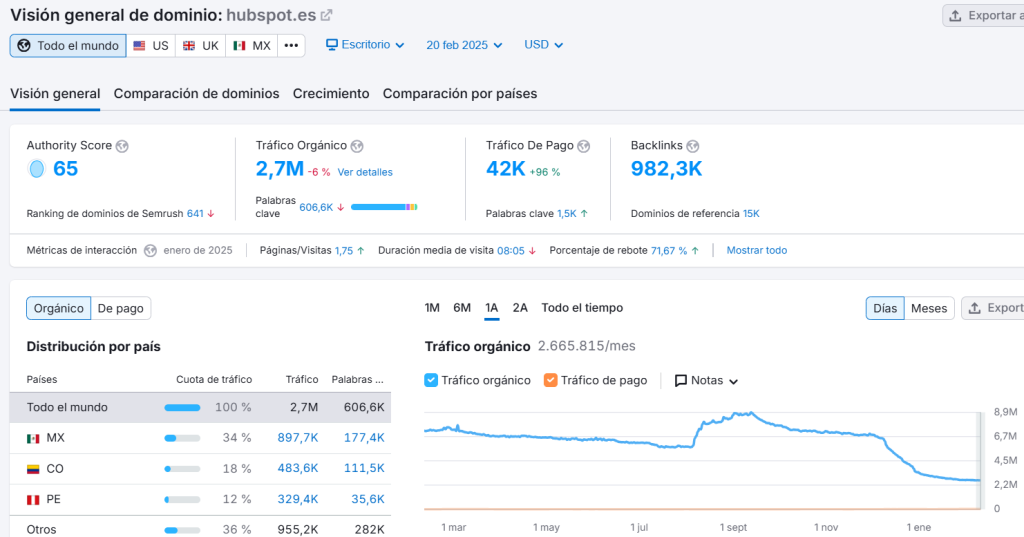Según datos de Semrush, el tráfico de hubspot.es pasó de 8,9 millones de visitas en septiembre/octubre 2024 a 2,6 millones en enero de este mismo año.