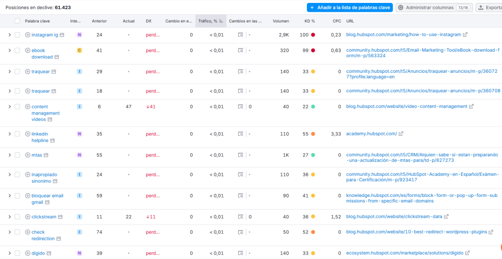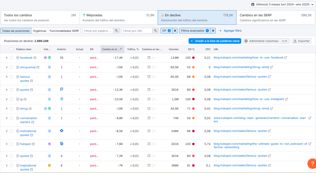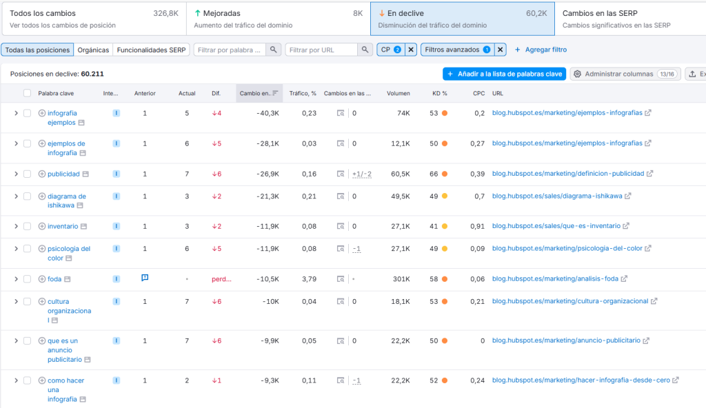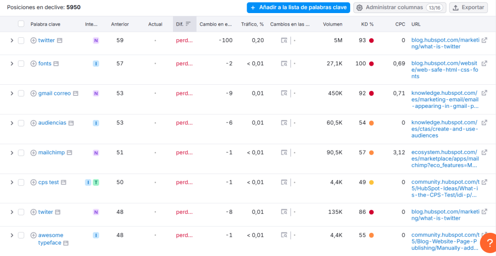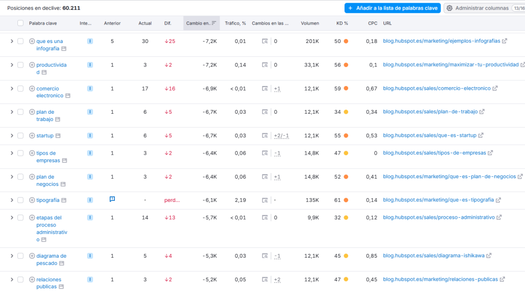 Al analizar las palabras clave que han sufrido mayores pérdidas de tráfico, encontramos los siguientes ejemplos: