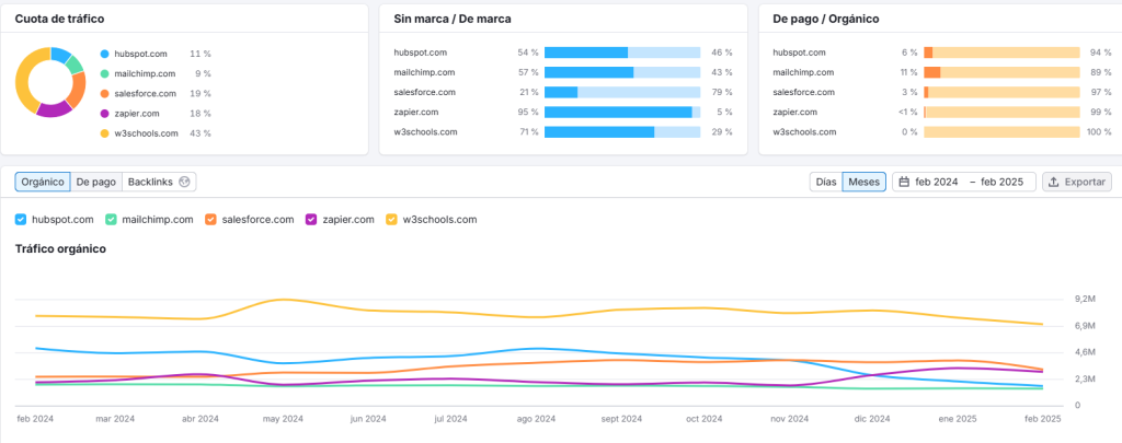 De los pantallazos anteriores, se observa que Salesforce y Zapier han ido ganando territorio frente a un hubspot que disminuye notablemente el tráfico en Noviembre del 2024.
